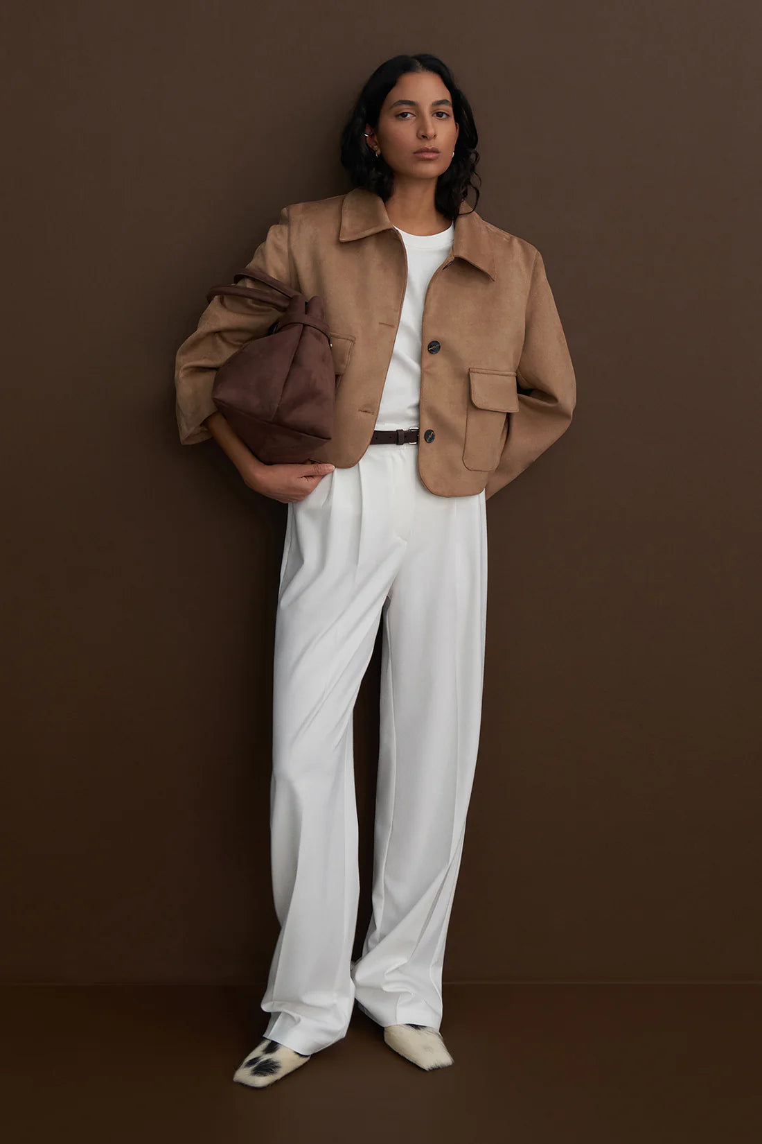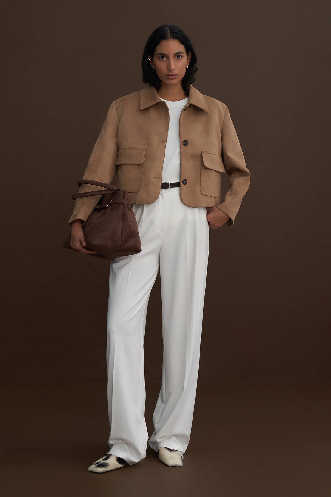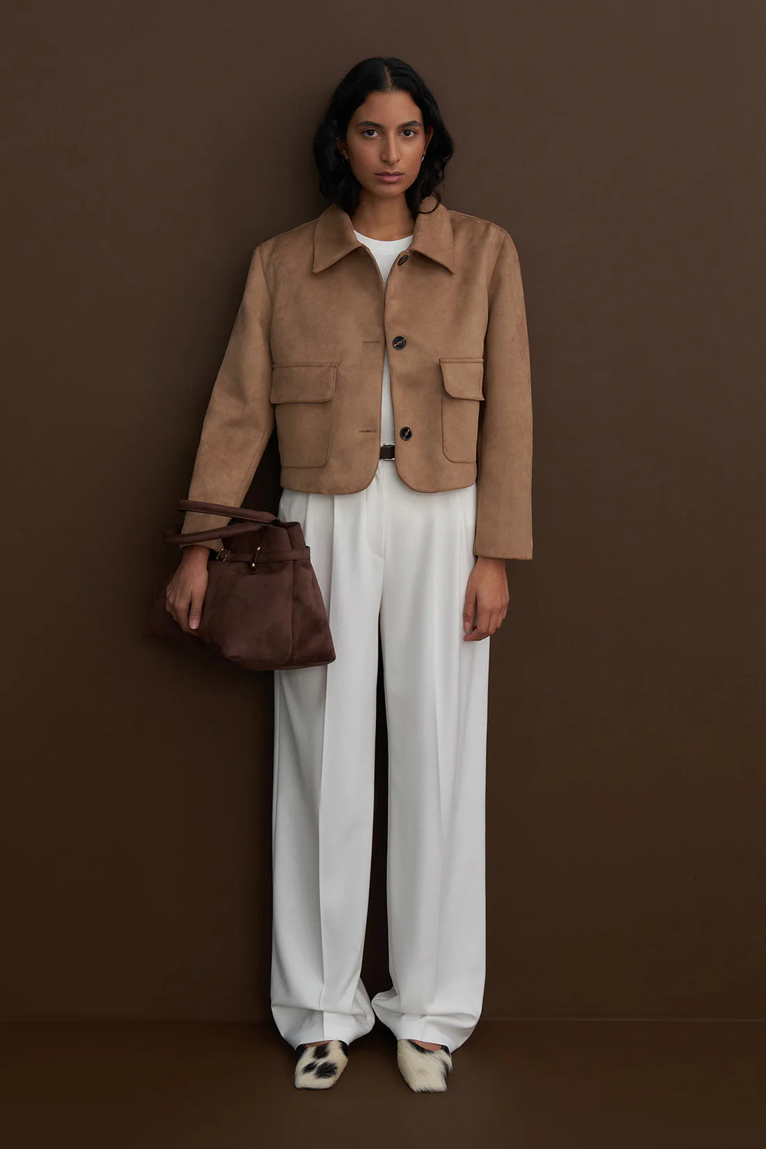 Süet dokusu ve kısa boy tasarımıyla öne çıkan bu ceket, modern ve şık bir görünüm sunar. Rahat kesimi sayesinde hem günlük hem de özel kombinlerde kolayca kullanılabilir.