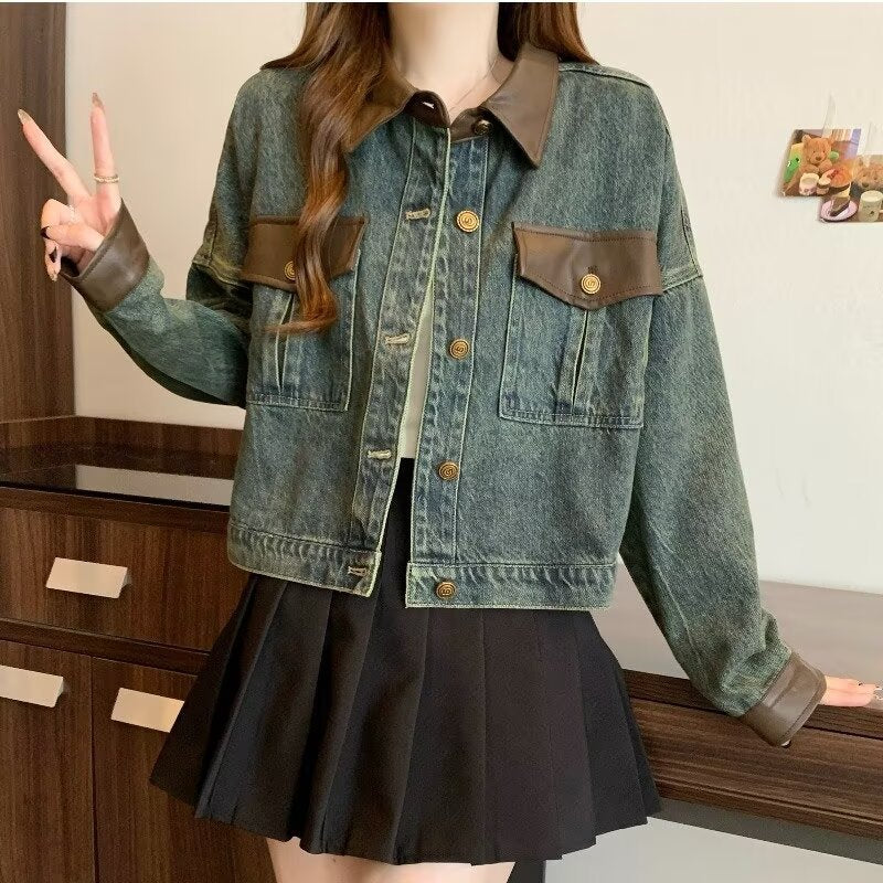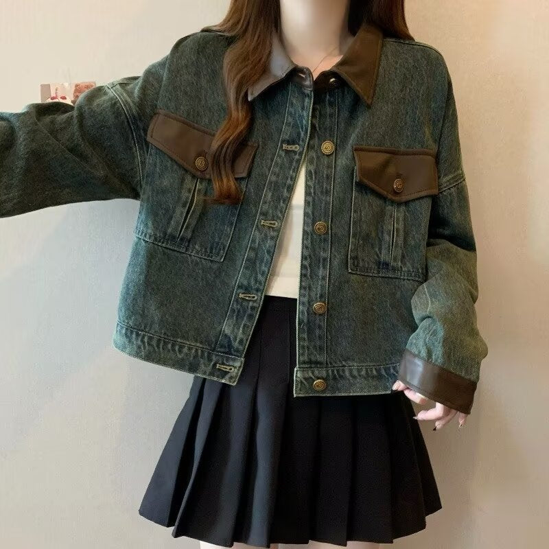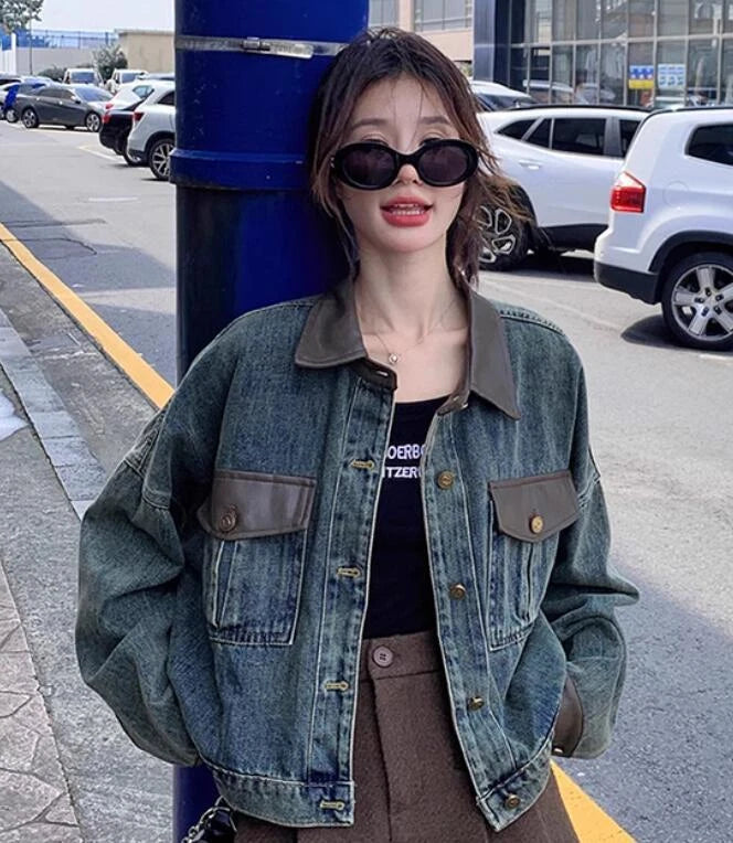 Model Tipi: Boxy fit – kısa boy, kontrast deri görünümlü yaka/cep/manşet, klasik düğmeli denim ceket