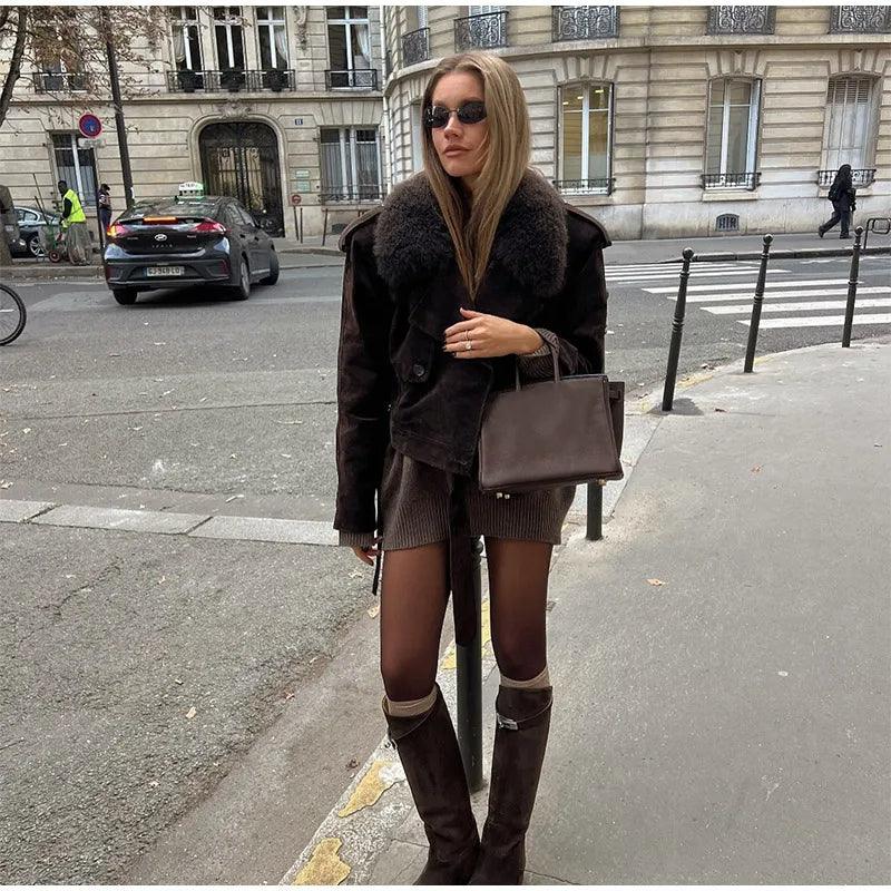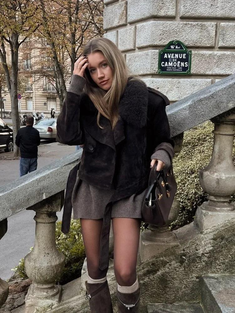 Zengin kahverengi renkteki bu şık kırpılmış süet ceket ile kış gardırobunuzu yükseltin. Daha fazla sıcaklık ve şıklık için lüks bir suni kürk yakaya sahip olan ceket, tek düğmeli çift düğmeli bir ön kısım sergiliyor. Ayarlanabilir bel kemeri özel bir dokunuş katarken, yapılandırılmış omuzlar cesur, modern bir siluet sağlar. Günlük gezintiler veya şık gece kıyafetleriyle eşleştirmek için mükemmel olan bu ceket, konforu zamansız modayla birleştiriyor.