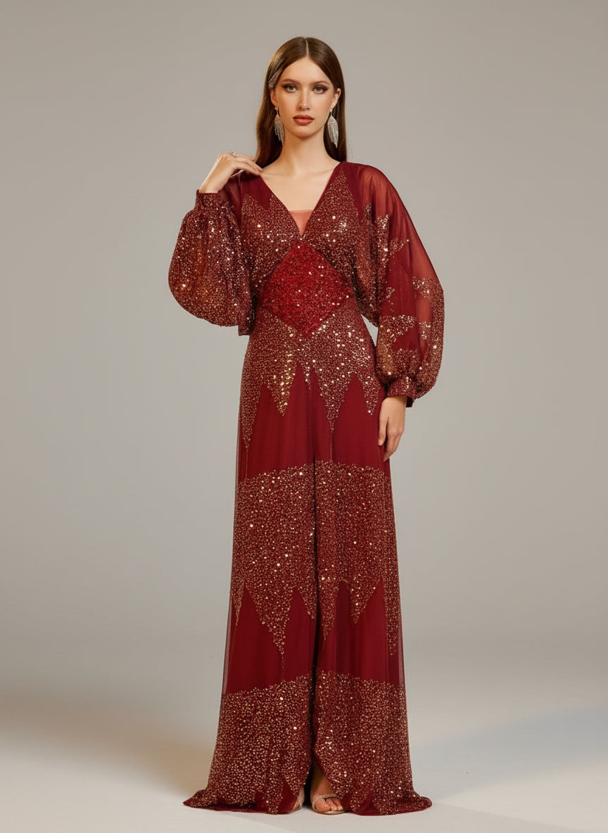 Bu fener kollu, V yakalı, yüksek yırtmaçlı siyah balo elbisesiyle göz kamaştırın! Zarif fener kolları ve çekici yüksek yırtmacıyla tüm gece boyunca bakışları üzerinize çekeceksiniz. V yaka sofistike bir dokunuş katarken, şık siyah renk hem zamansız hem de çok yönlüdür. Bu çarpıcı elbiseyle balo deneyiminizi bir üst seviyeye taşıyın.