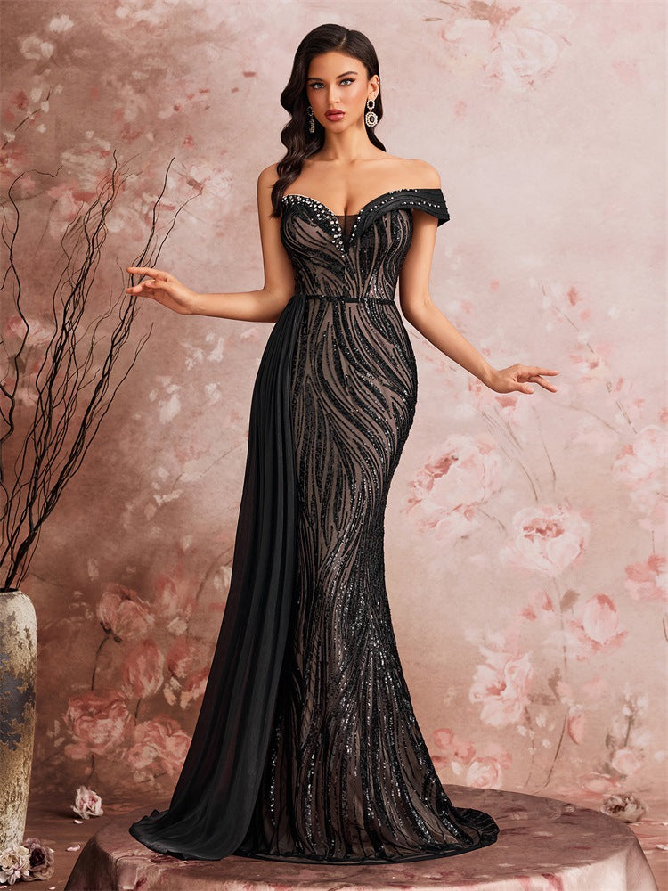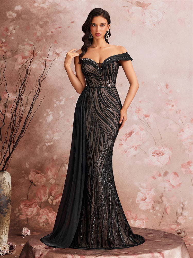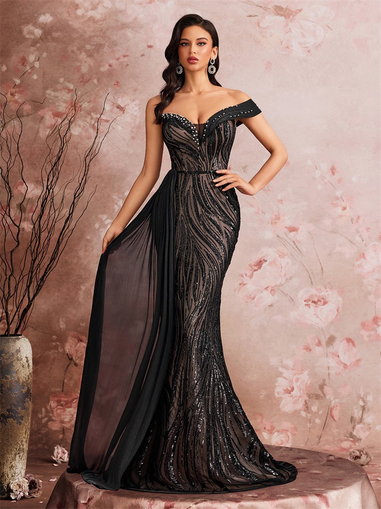 - Göz alıcı silüet : Omuzları açıkta bırakan kalp yaka, romantik ve çekici bir görünüm yaratırken; balık etek, zarif bir figürü vurgulamak için kıvrımları sarar ve uçuşan şeffaf kuyruk, dramatik, kırmızı halıya yakışır bir çekicilik katar.
