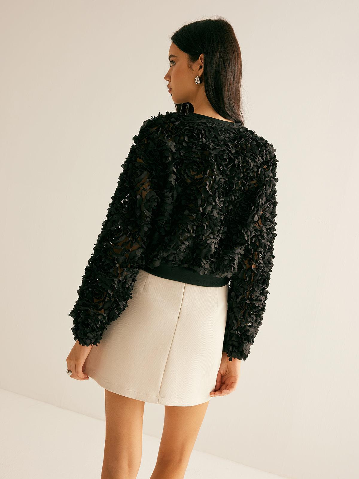 - 3D Çiçek Motifleri: Ceketin tamamını kaplayan kabartmalı çiçek desenleri, tasarımın ana odak noktasını oluşturuyor.